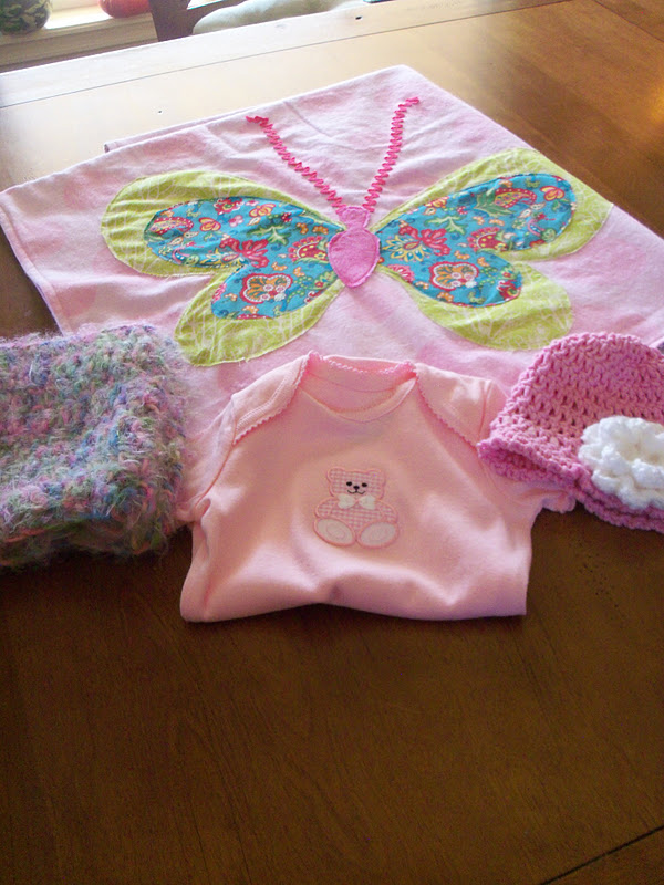 Still need to make a quilt, diaper wipe case, a fleece blanket with crocheted edge and some Pee Pee Tee Pees. Oh, and I have to have it all finished by next Friday, as that is when I leave to go visit them in NM. Guess I work better under pressure!